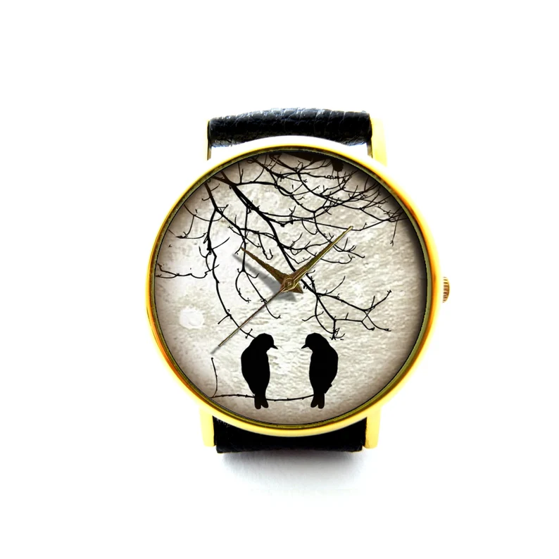 Birds And Moon Leather Watch, Birds On Tree Leather Watch, Unisex Watch, Ladies Watch, Mens Watch, Birds Jewelry, Pattern 9
